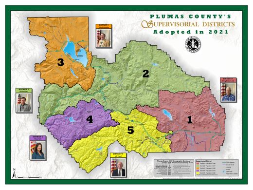 2021 Supervisorial Districts | The Supervisorial District boundaries shown on this map were approved by the Plumas County Board of Supervisors on December 7, 2021 (ordinance 2021-1141 effective January 7, 2022) using information from the 2020 Decennial Census. To view the interactive version of this map, click HERE. | To download individual districts, please click your selection below: | Download Display File (PDF) | 4.3 MB | 34"x44" (E-SIZE) |