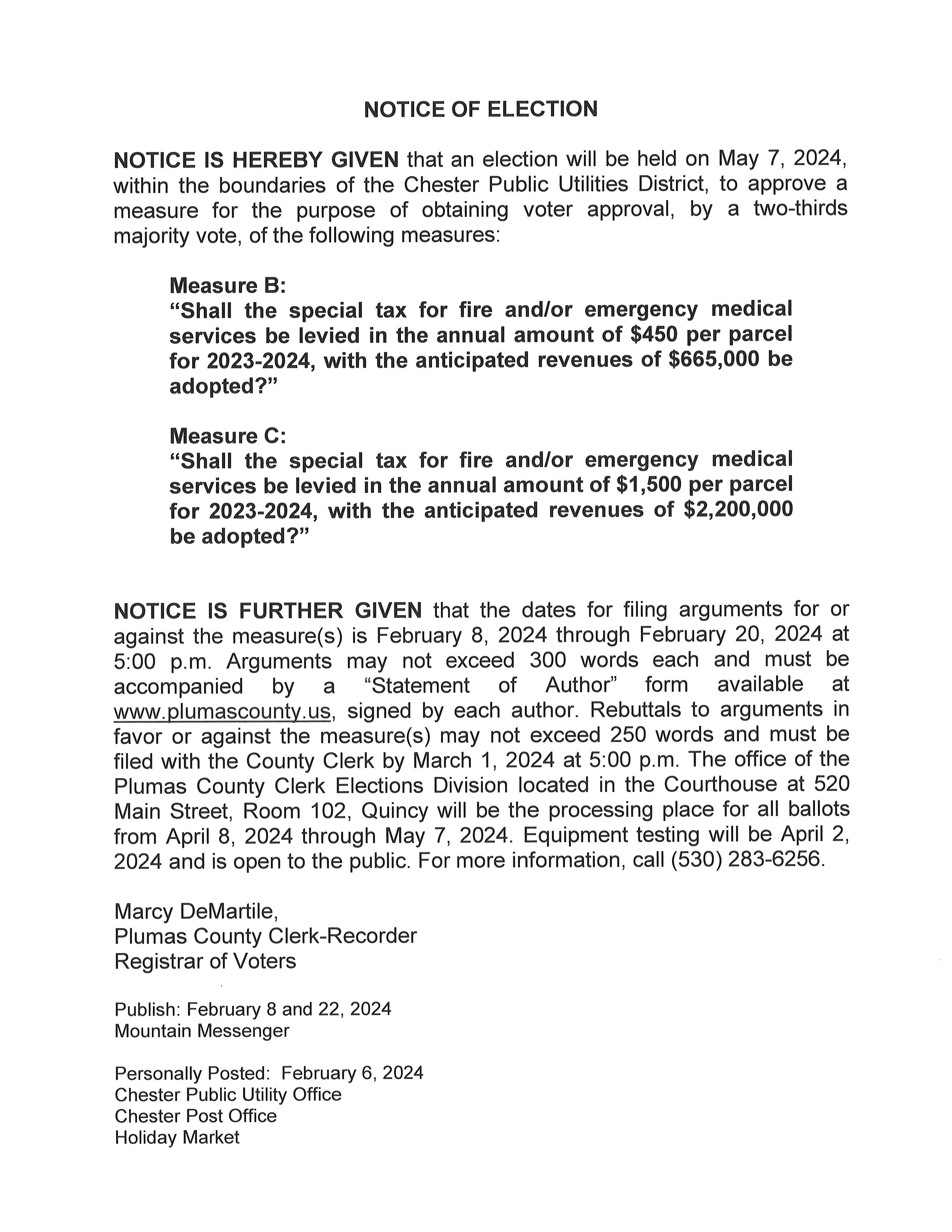 November 7, 2023 Notice of Election for Chester Public Utilities District
