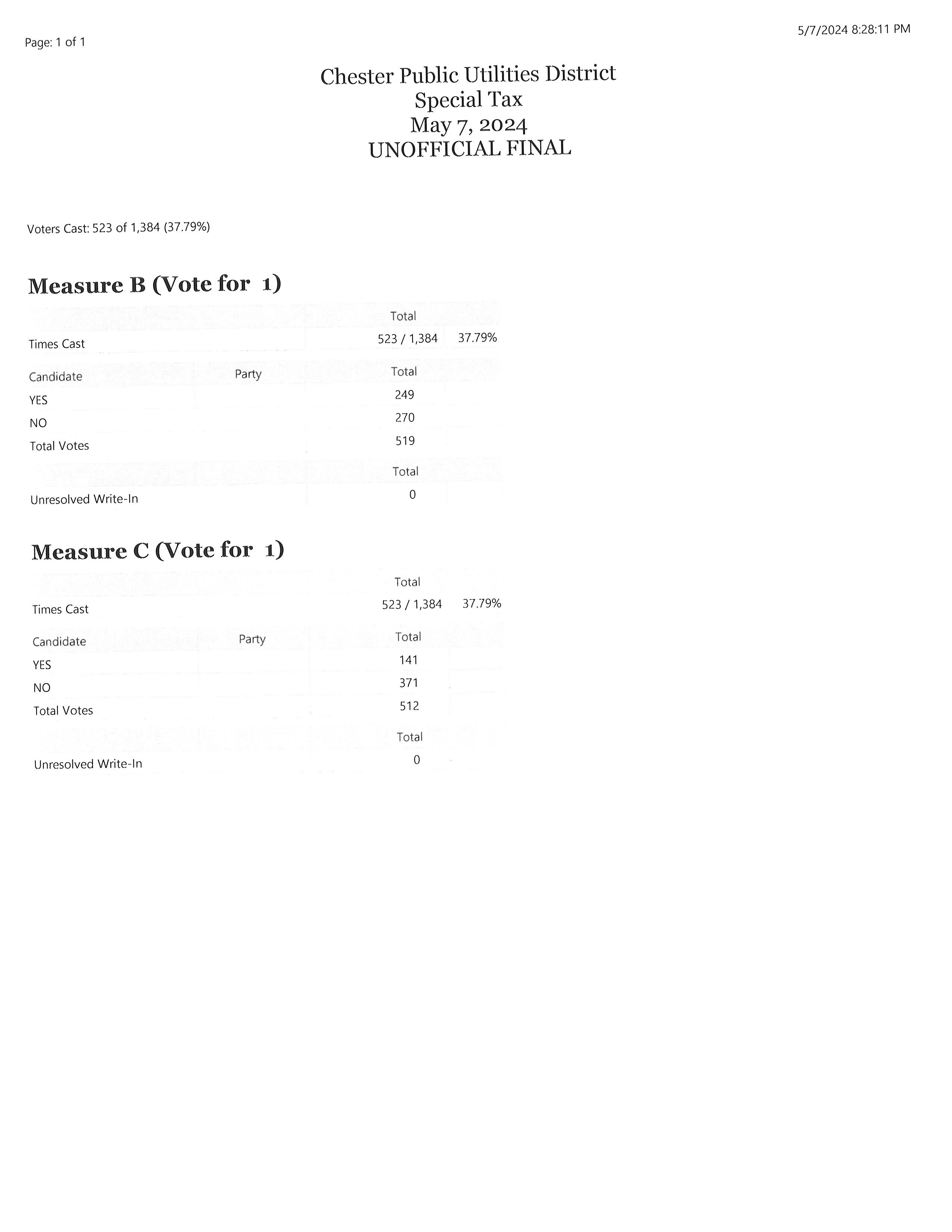 May 7, 2024 Special Tax Election Unofficial Results